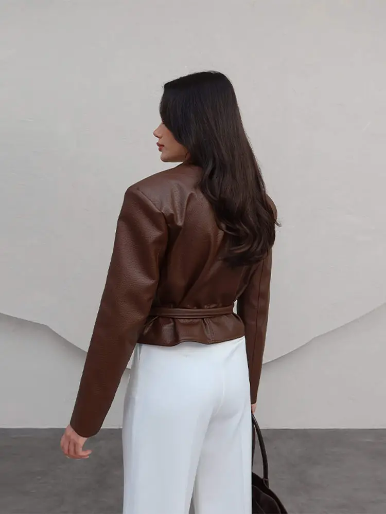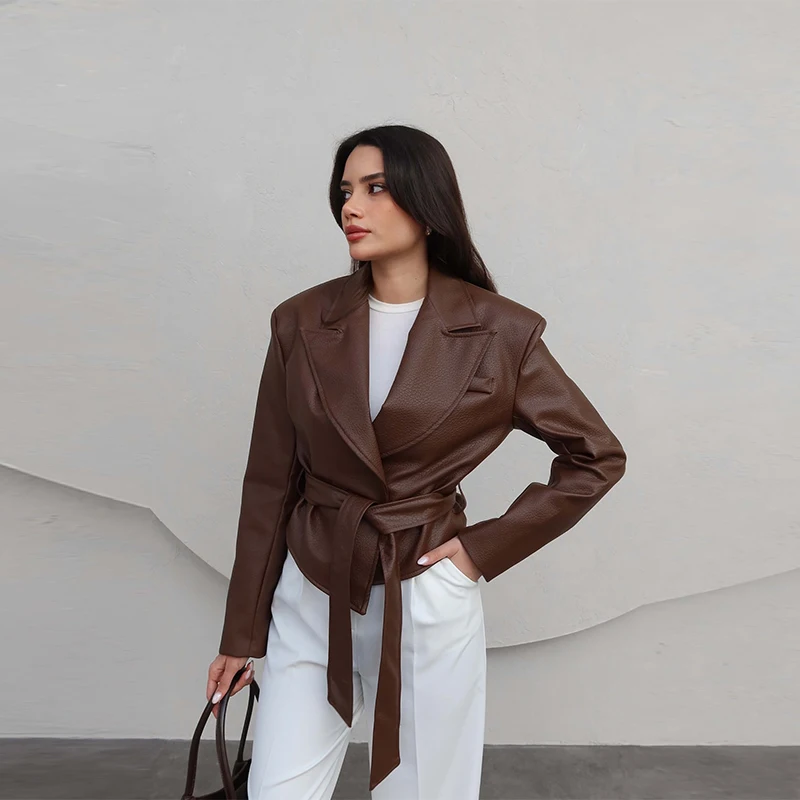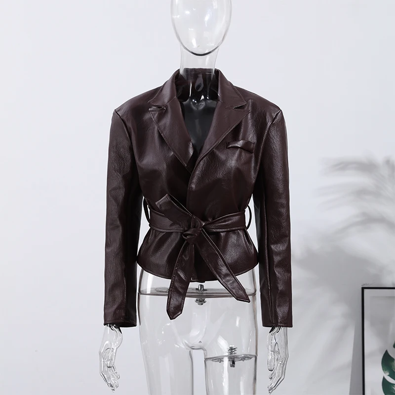 Pourquoi choisir la Veste Skaï avec ceinture Marron foncé pour un style unique et durable